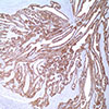 Anti-cytokeratin 19 reacts with a wide variety of epithelia and epithelial malignancies including adenocarcinomas of the colon, stomach, pancreas, biliary tract, liver, and breast. Perhaps the most useful application is the identification of thyroid carcinoma of the papillary type, although follicular carcinoma is also labeled by this antibody approximately 50%-60% of the time.